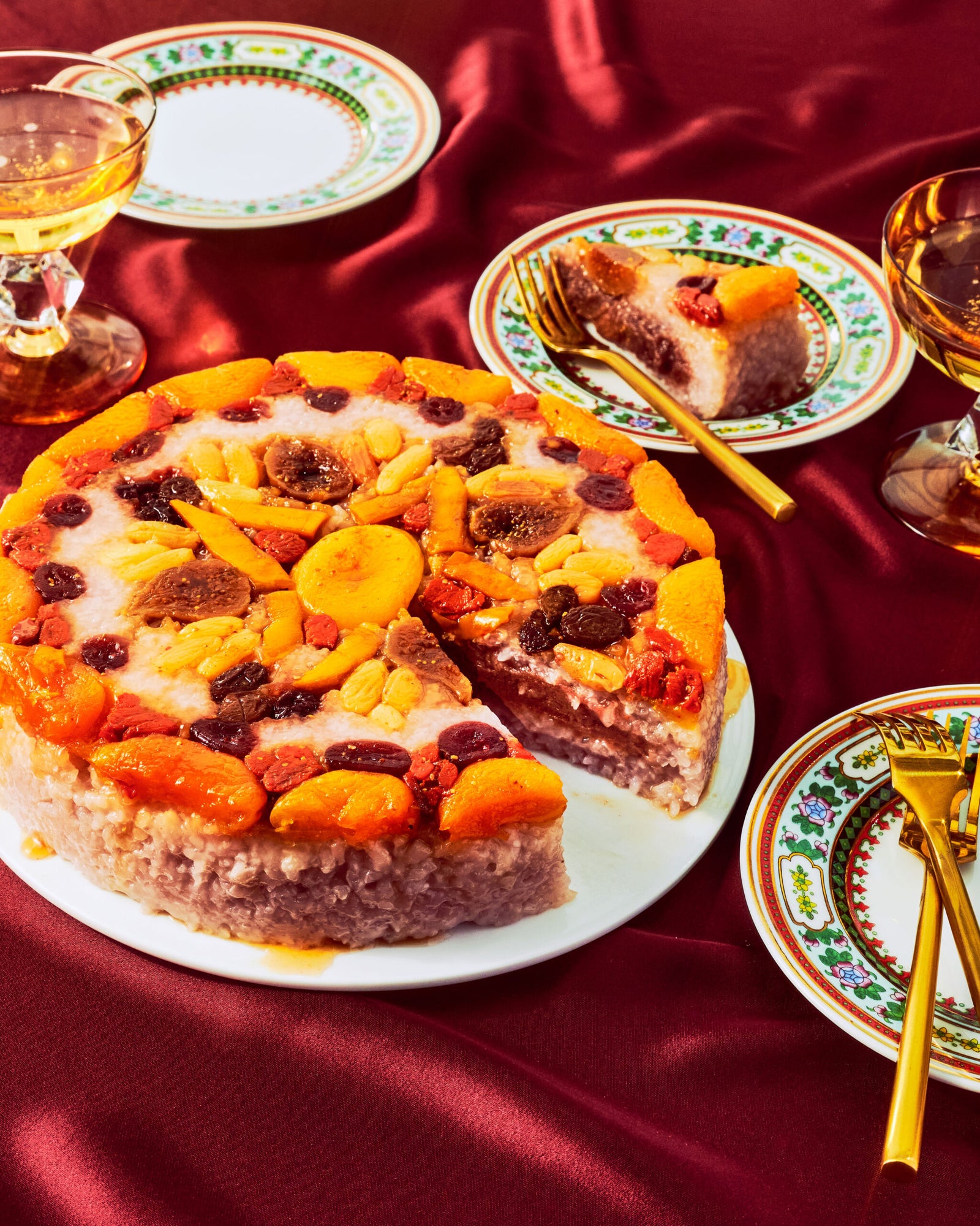 Ба бао фан — традиционный китайский десерт, который готовят на Лунный Новый год для привлечения богатства и процветания. Это паровой рисовый пирог с начинкой из сладкой пасты из красной фасоли и «восемью сокровищами» в виде глазированных сушеных фруктов. В этой версии рис ароматизирован цветами гибискуса, а начинка обогащена сливочным маслом, ванилью и китайской смесью специй, что придает десерту нежный цветочный оттенок и пряный вкус. Подавайте пирог охлажденным, нарезанным на порционные кусочки, посыпанным хлопьями морской соли для контраста сладости.