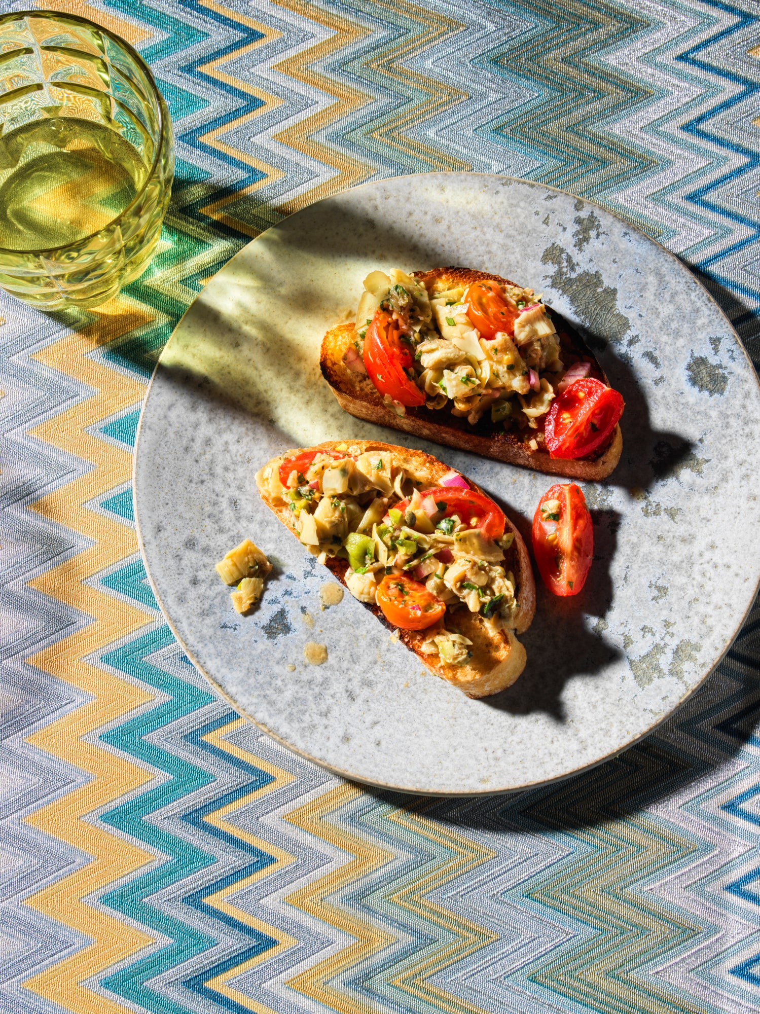 Этот рецепт брускетты с артишоками, каперсами и вишнёвыми помидорами вдохновлён итальянско-американской кухней и разработан исполнительным шеф-поваром рестораном Greens в Сан-Франциско Кэти Райхер. Блюдо отличается свежим, ярким вкусом с нотками кислинки от уксуса и каперсов, хрустом оливок и ароматом трав. Оно подаётся как лёгкая закуска на поджаренном хлебе, идеально подходит для вечеринок или как начало ужина, готовится за считанные минуты.