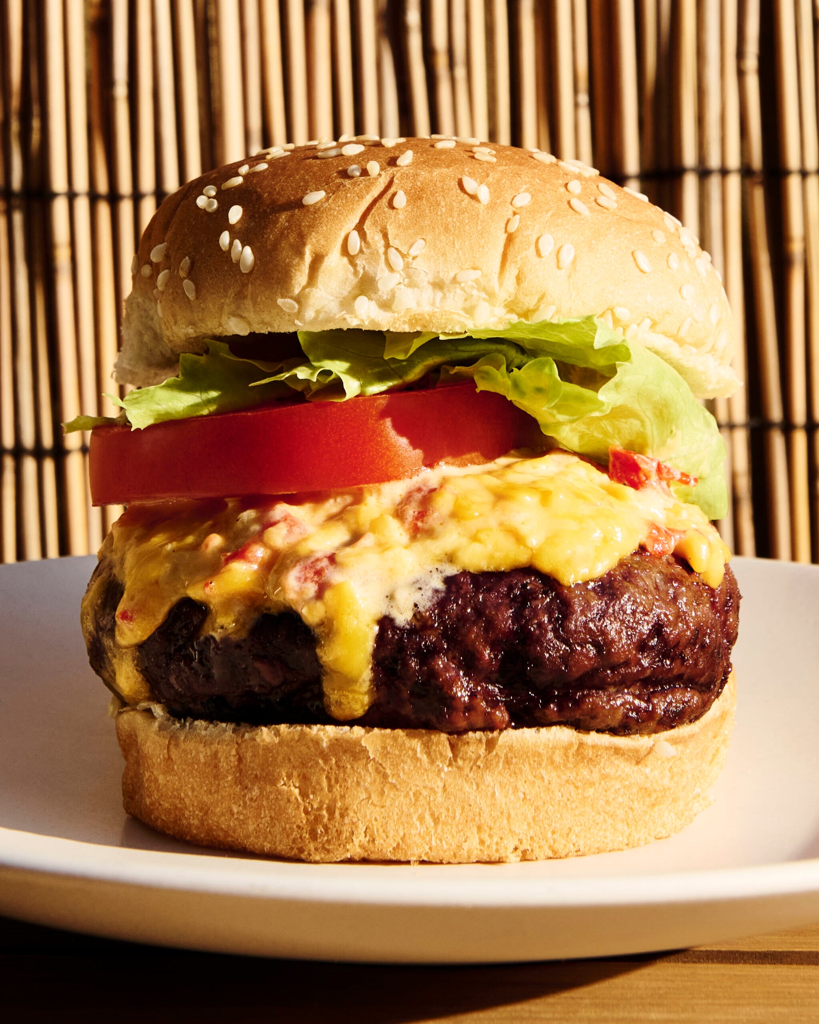 Намажьте по 30 мл (2 ст. л.) пименто-сыра на каждую горячую котлету, накройте крышкой или фольгой и дайте сыру расплавиться 1–2 минуты (до мягкой тянущейся текстуры). Разложите нижние половинки булочек на тарелках, выложите котлеты, добавьте ломтики помидоров и листья салата, накройте верхними половинками и подавайте сразу.