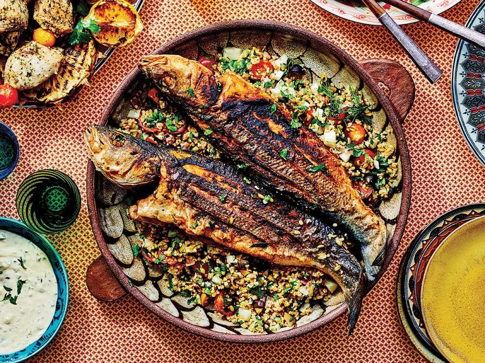 Этот рецепт жареной целой рыбы в галилейском стиле происходит из традиционной кухни Галилеи в Израиле, где рыбу часто готовят целиком для сохранения сочности и аромата. Блюдо сочетает свежесть средиземноморских ингредиентов с пряными нотками кумина, паприки и чеснока, придающими хрустящей корочке яркий вкус. Подавайте горячим с дольками лимона и, по желанию, с салатом из фрике с фенхелем и чили для контраста текстур.