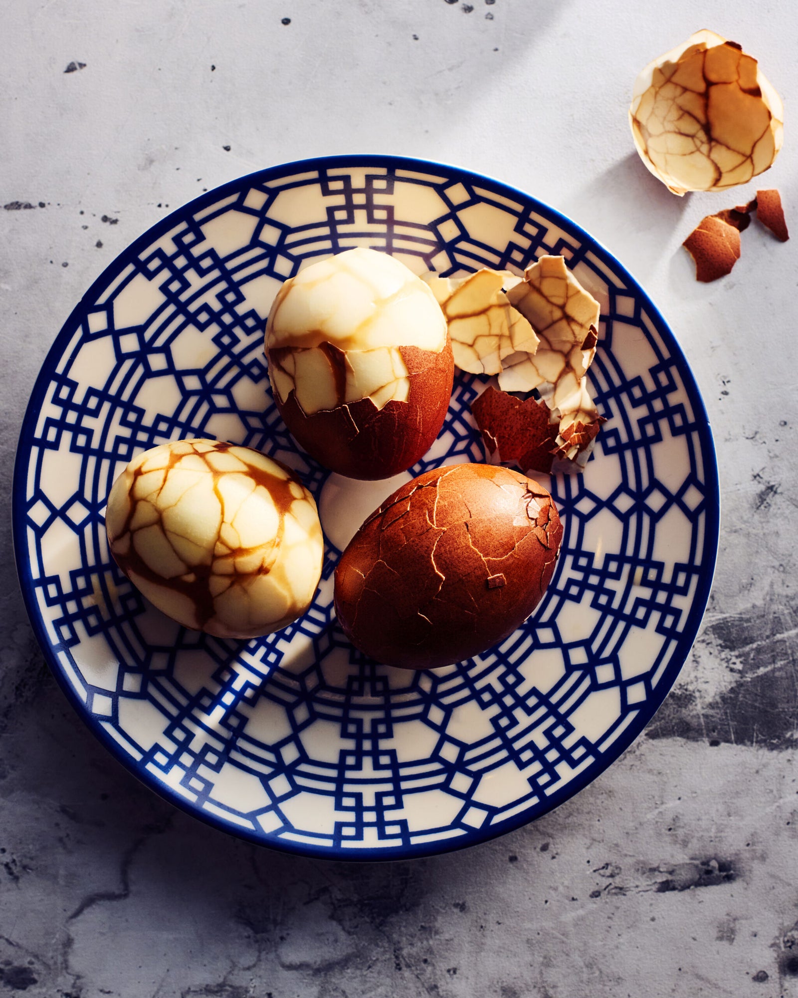 Китайские чайные яйца (cha ye dan) — популярная закуска с насыщенным ароматом и необычным мраморным рисунком на скорлупе. Их готовят, сварив яйца вкрутую, слегка потрескав скорлупу, а затем томя в пряном настое на основе черного чая, корицы, звёздочек аниса и гвоздики. Настой придаёт яйцам сладковатый вкус, глубокий цвет и пикантный аромат. В Китае и Тайване существует множество вариантов этого классического рецепта, часто добавляют соевый соус, сахар и чёрный перец для усиления вкуса. Эти яйца отлично подходят в качестве лёгкой закуски или дополнения к рису и азиатским блюдам.