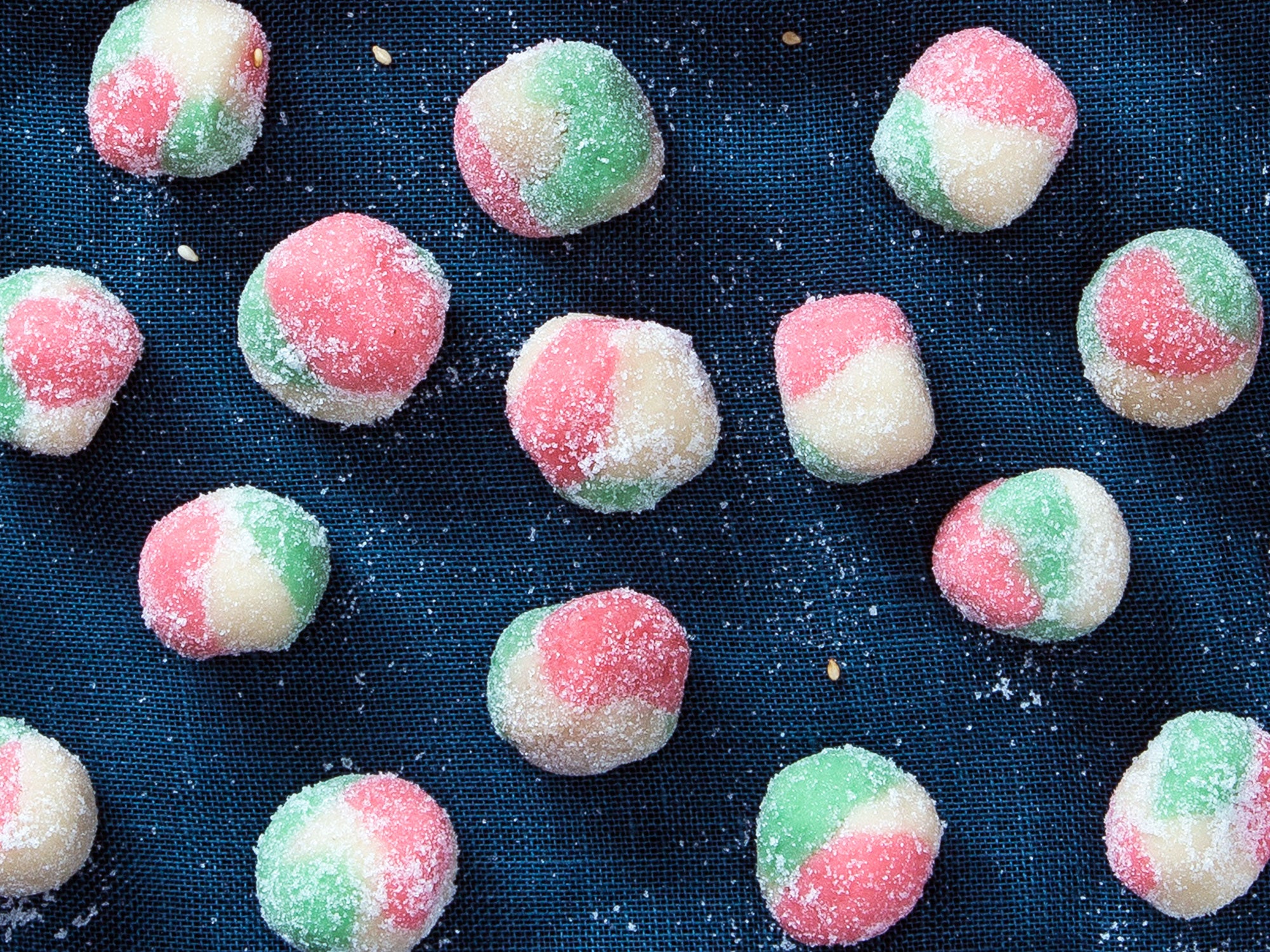 На чистой рабочей поверхности скатайте белое тесто в жгут длиной около 80 см и толщиной 1 см; повторите с красным и зелёным тестом. Заплетите три жгута в косы, разрежьте на ~30 кусочков по 2 см. Каждый кусочек скатайте в шарик, выложите на блюдо и обваляйте в сахарной пудре.