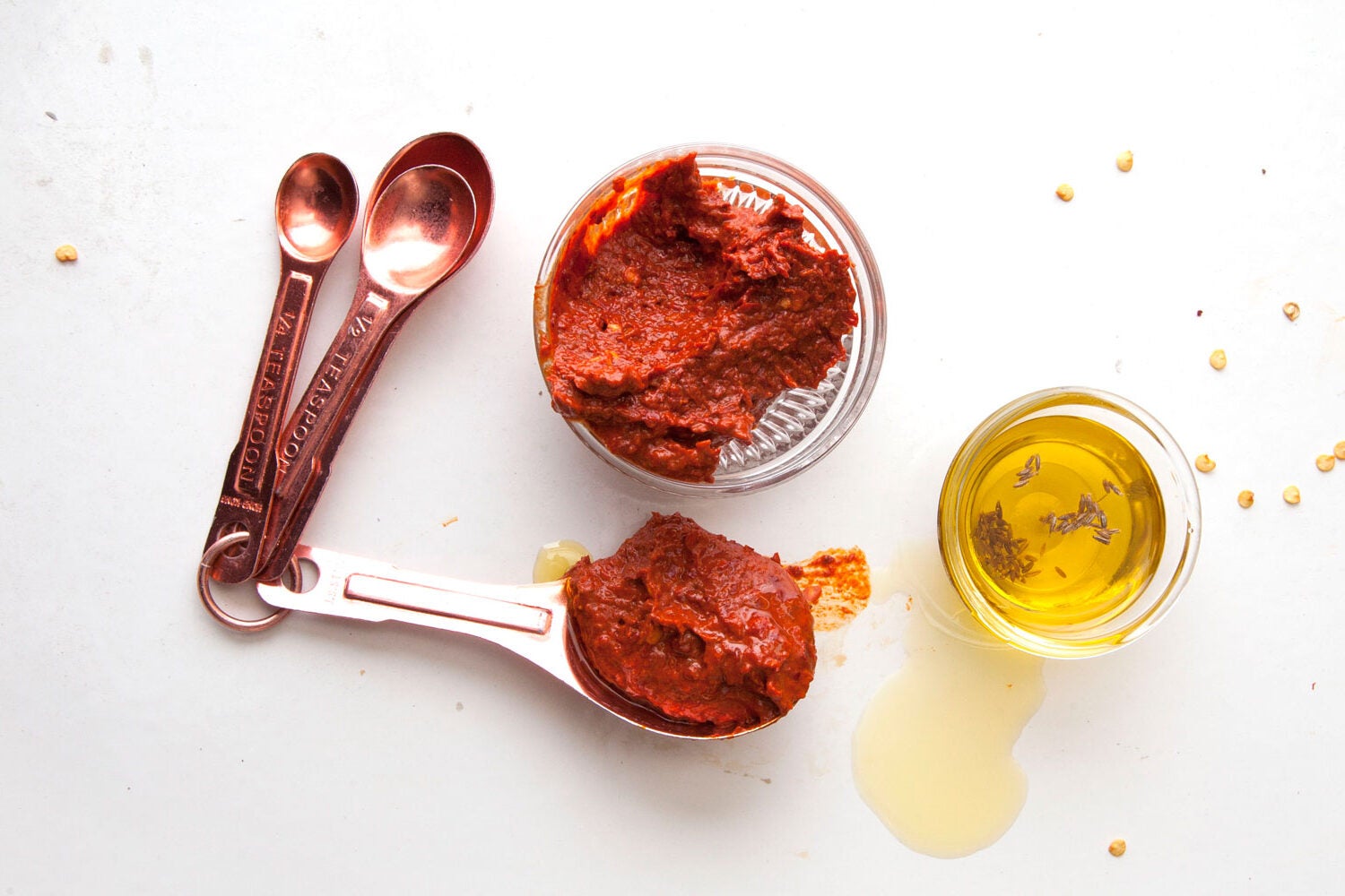 Слейте воду с чили и переложите их в чашу кухонного комбайна вместе с молотыми специями, оливковым маслом, солью, чесноком и соком лимона. Измельчите, периодически очищая стенки чаши, до получения гладкой пасты, около 2 минут. Переложите пасту в стерилизованную стеклянную банку объёмом 0,5 л и залейте оливковым маслом так, чтобы ингредиенты были погружены на 1 см. Храните в холодильнике, доливая масло после каждого использования. Паста хранится до 3 недель.