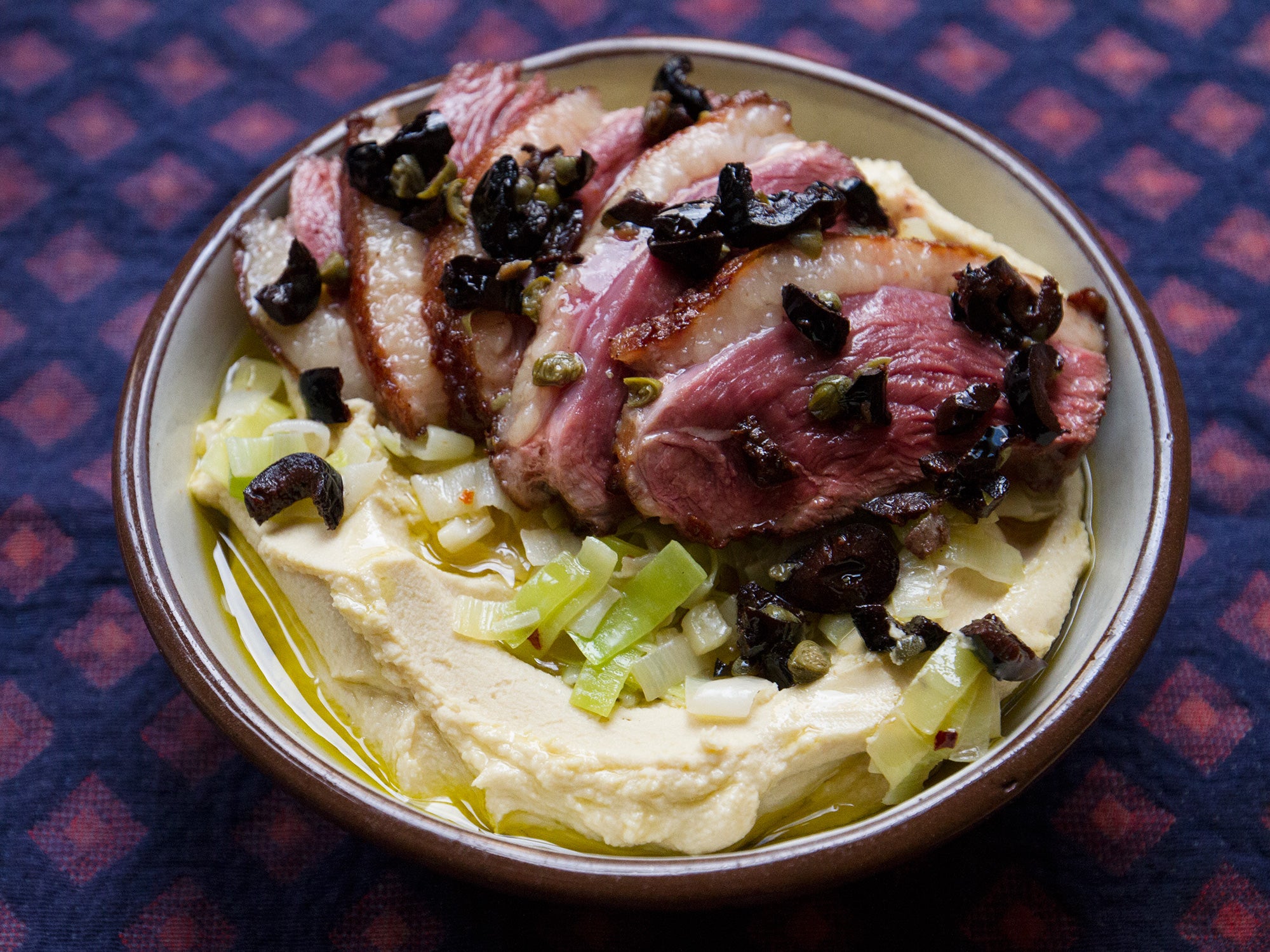 Этот рецепт хумуса с жареной уткой, пореем и тапенадой разработан шеф-поваром Алоном Шая из ресторана Shaya в Новом Орлеане, вдохновлённый израильской кухней. Кремовый хумус сочетается с хрустящей кожей утки, нежным пореем и пикантной тапенадой из оливок и анчоусов, создавая богатый вкус с нотками свежести от лимона и специй. Блюдо подаётся как закуска с пита-хлебом, идеально для праздничного стола, например, на Пасху.
