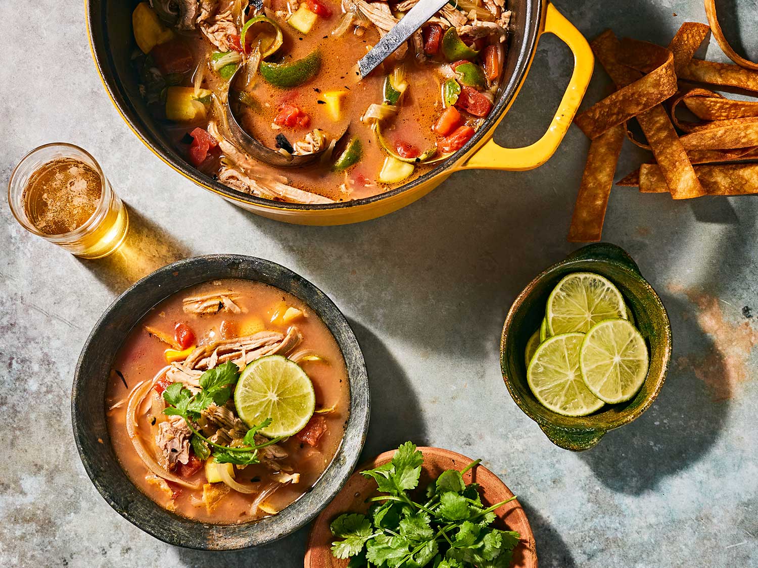 Сопа де лима — популярное блюдо из Мериды, столицы мексиканского штата Юкатан, где его подают и туристам, и местным жителям. Этот успокаивающий суп получает яркость от смеси свежего лимонного и лаймового сока с цедрой, имитирующей вкус местных кисло-сладких лим. Индейка, традиционно употребляемая на Юкатане веками, придаёт супу насыщенный вкус и экономичность; если голени индейки трудно найти, подойдут куриные бёдра без кожи. Подавайте горячим в мисках с кинзой, кукурузными чипсами и ломтиками лайма для свежести.