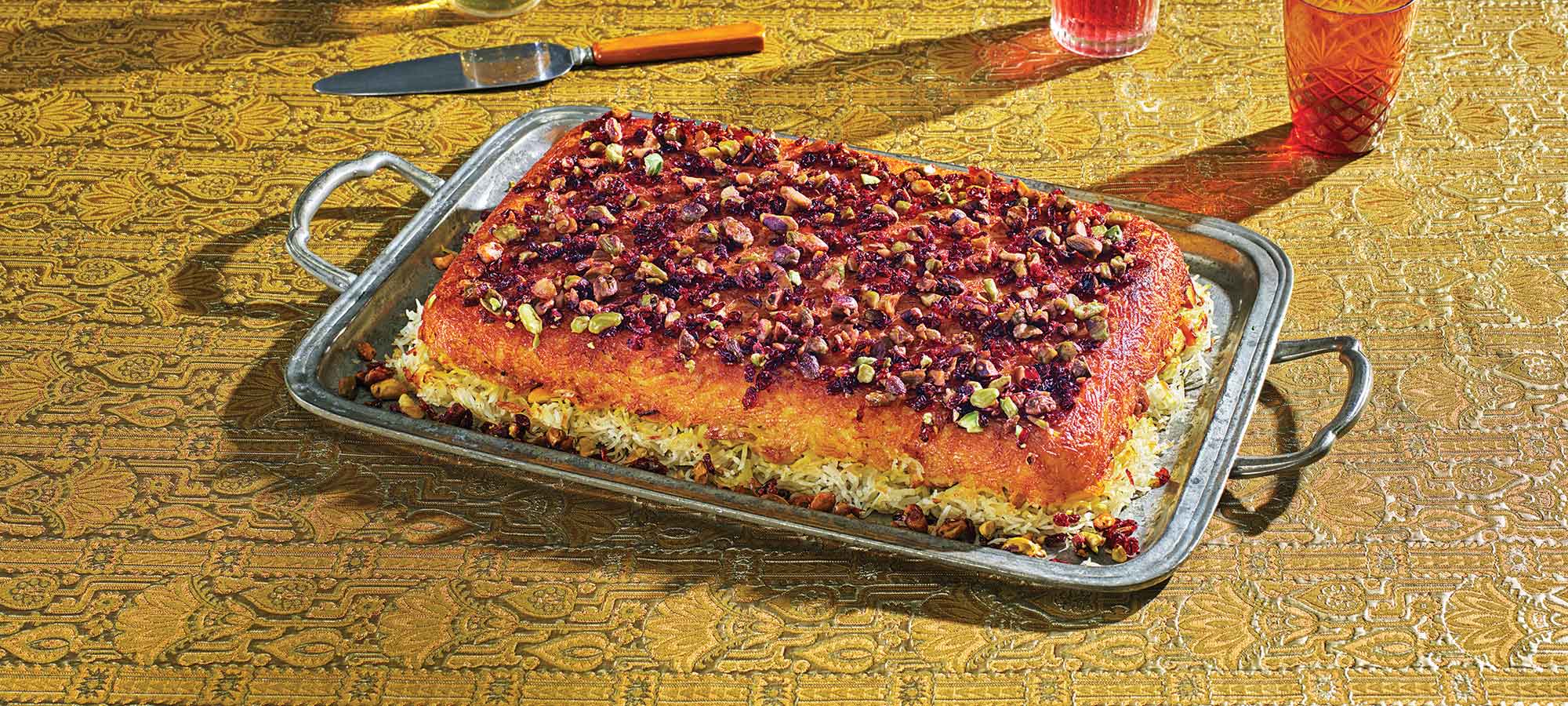 6. Аккуратно проведите лопаткой по краям сковороды, чтобы отделить тахдиг. Накройте сковороду большим плоским блюдом и резко переверните, чтобы рис вывалился целиком с корочкой сверху. Разделите на порции и подавайте горячим.
