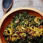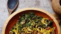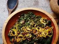 Это блюдо — традиционный однокорытный гарнир из Западной Африки, особенно популярный в Сенегале, где его приготовил шеф-повар Пьер Тиам. Листья колларда или репы смешиваются с арахисовым маслом для кремовой текстуры и земляного орехового вкуса, дополненного ферментированными морепродуктами и остротой чили. Получается сытный, ароматный гарнир с нотками сладости от карамелизованных овощей, который подают теплым как дополнение к основному блюду, например, к рису или мясу.