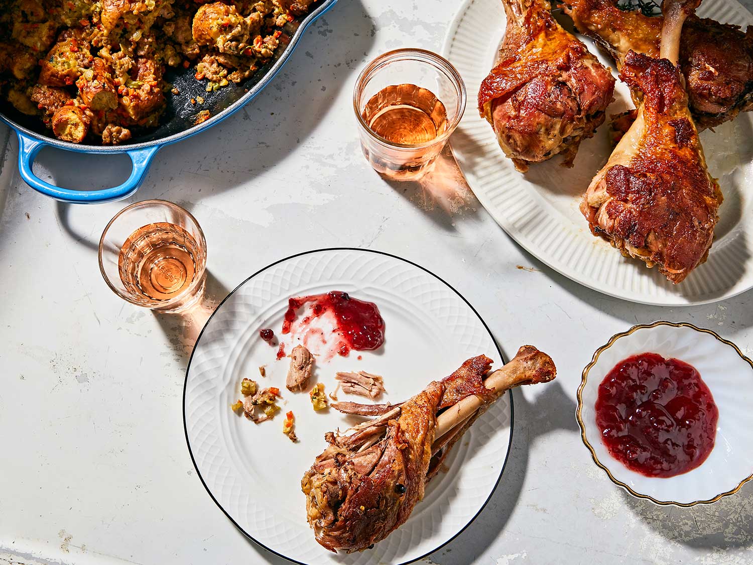 Когда готовы подавать, верните кастрюлю на плиту на слабый огонь и прогрейте голени до тепла, 30–35 минут. В большой сковороде на среднем огне разогрейте 60 мл утиного жира. Когда жир очень горячий, выложите голени кожей вниз. Обжаривайте, периодически переворачивая, до хрустящей корочки со всех сторон, 11–13 минут. Переложите на блюдо и подавайте с брусничным джемом.