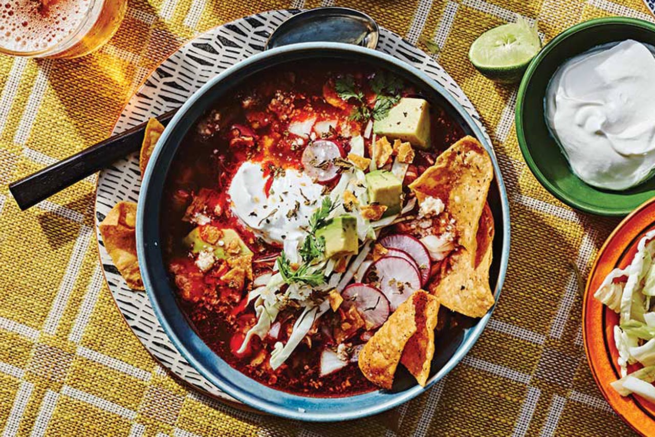 Позоле рохо — традиционный мексиканский суп из центральной Мексики, где каждая версия сочетает свинину с разными сушеными чили для насыщенного красного цвета и остроты. Эта рецептура сочетает нежное мясо из лопатки и ребрышек, вареный гомини (кукурузную крупу) и ароматный бульон с гуахильо и анчо, создавая густой, пикантный вкус с дымными нотками. Подавайте горячим в глубоких тарелках, дополнив каждый порцию любимыми гарнирами: ломтиками лайма, нарезанной капустой, луком, авокадо, сыром, кинзой и тортильями для аутентичного праздничного блюда.