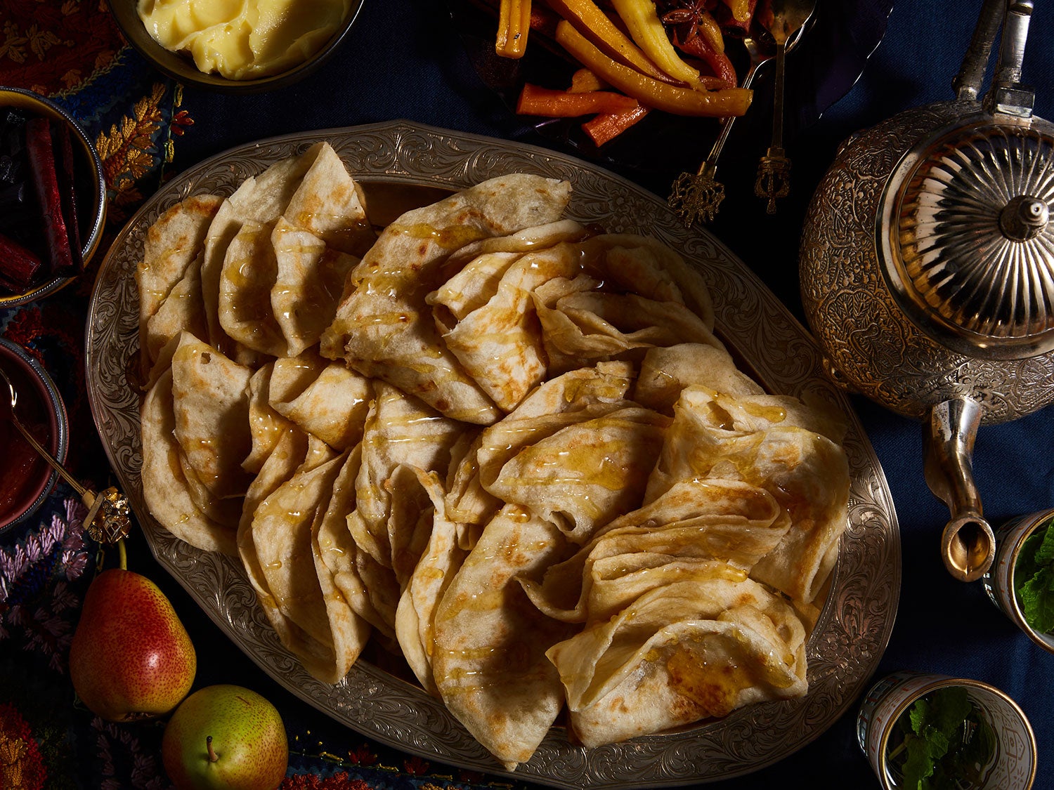 Муфлета — это традиционные мягкие марокканские блины, которые подаются с медом и являются центральным блюдом праздника Мимуна, отмечаемого североафриканскими евреями на следующий день после Песаха. Эти простые лепешки имеют нежную текстуру, слегка сладкий вкус благодаря меду и идеально подходят для десерта или легкого перекуса. Подавайте их теплыми, сложенными стопкой на подогретом блюде, сбрызнув медом и, по желанию, добавив размягченное сливочное масло.