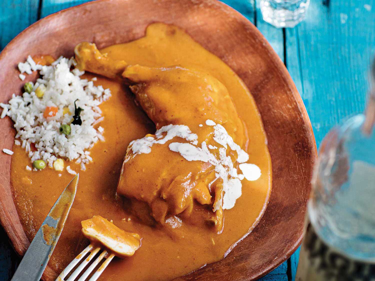 Это классическое домашнее блюдо из Оахаки (Мексика), адаптированное из книги «Oaxaca: Home Cooking from the Heart of Mexico» авторов Брисии Лопес и Хавьера Кабрала. Кремовый соус на основе чипотле придаёт курице пикантный копчёный вкус с нотками томатов и специй, делая блюдо сытным и ароматным. Его редко подают в ресторанах, предпочитая готовить дома для близких. Подавайте с тёплыми тортильями и полейте сметаной для свежести.
