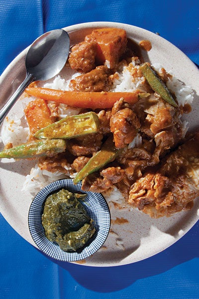 1. Приготовьте тушёное мясо: разогрейте оливковое масло в кастрюле ёмкостью 8 л на среднем огне. Порциями посолите и поперчите баранину, обваляйте в муке и обжарьте, переворачивая, до золотистой корочки со всех сторон, около 6 минут. Выньте мясо шумовкой в миску и отставьте. Добавьте в кастрюлю чеснок, морковь, сельдерей, чили, лук, репу и цукини, обжаривайте, помешивая, до золотистости, около 12 минут. Всыпьте изюм, томатную пасту, паприку, имбирь, шафран, корицу и лавровые листы, готовьте, помешивая, до лёгкой карамелизации, около 3 минут. Верните баранину в кастрюлю вместе с бульоном, нутом, помидорами и капустой, доведите до кипения. Уменьшите огонь до среднего, накройте крышкой и тушите, периодически помешивая, до полной мягкости мяса и нута, около 2,5 часов. Посолите, поперчите, вмешайте петрушку и лимонный сок, держите в тепле.