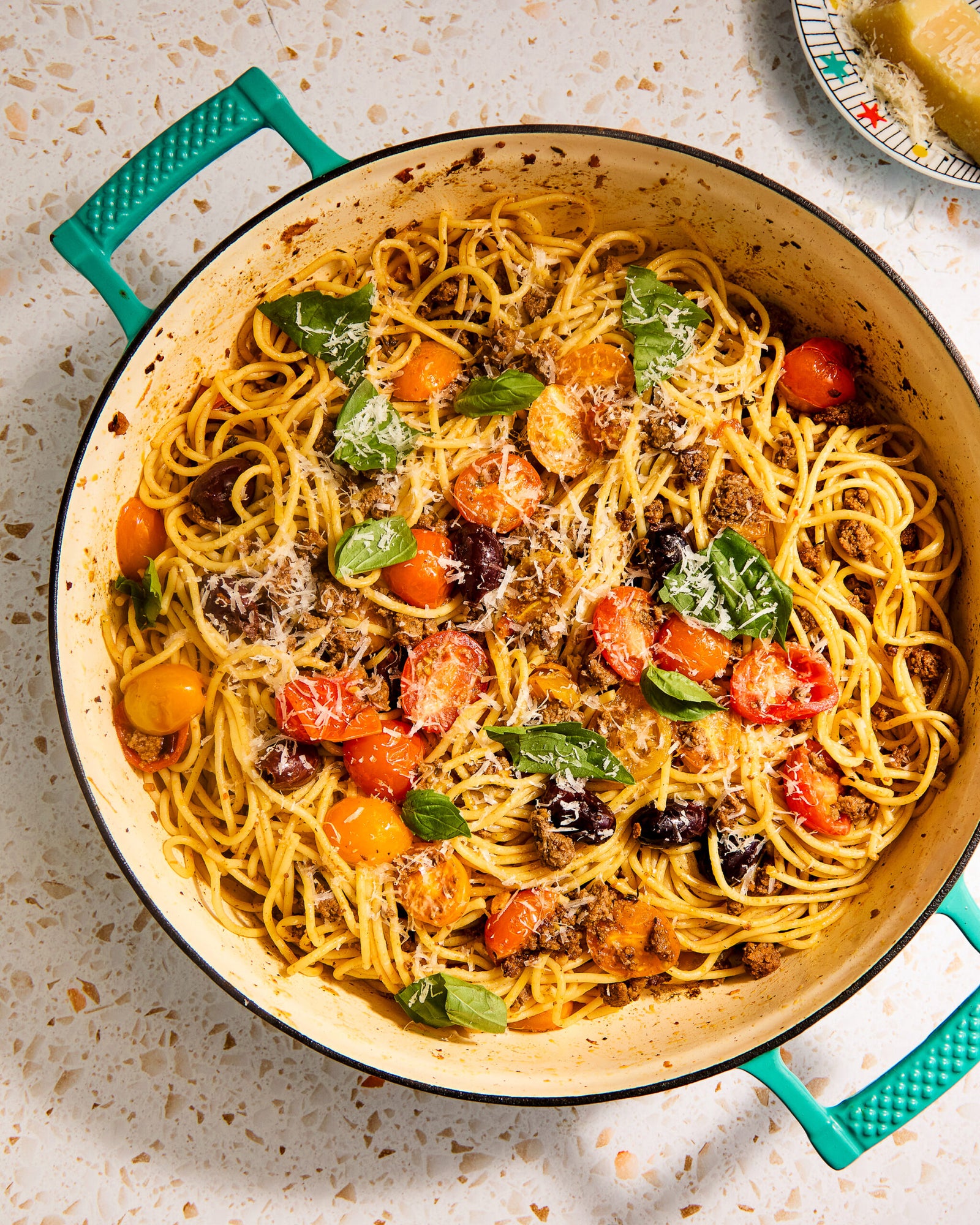 Этот летний болоньезе — адаптация классического итальянского блюда от австралийской кулинарной писательницы Донны Хей из её книги «The New Classics». Он сохраняет уютный вкус традиционного болоньезе, но делает его лёгким и свежим благодаря сезонным черри-помидорам и базилику, без тяжёлого красного соуса. Блюдо идеально для тёплого вечера: сочные помидоры и оливки добавляют яркости, а лёгкая кислинка от лимона и вина подчёркивает летние нотки. Подавайте горячим с натёртым пармезаном для усиления вкуса.