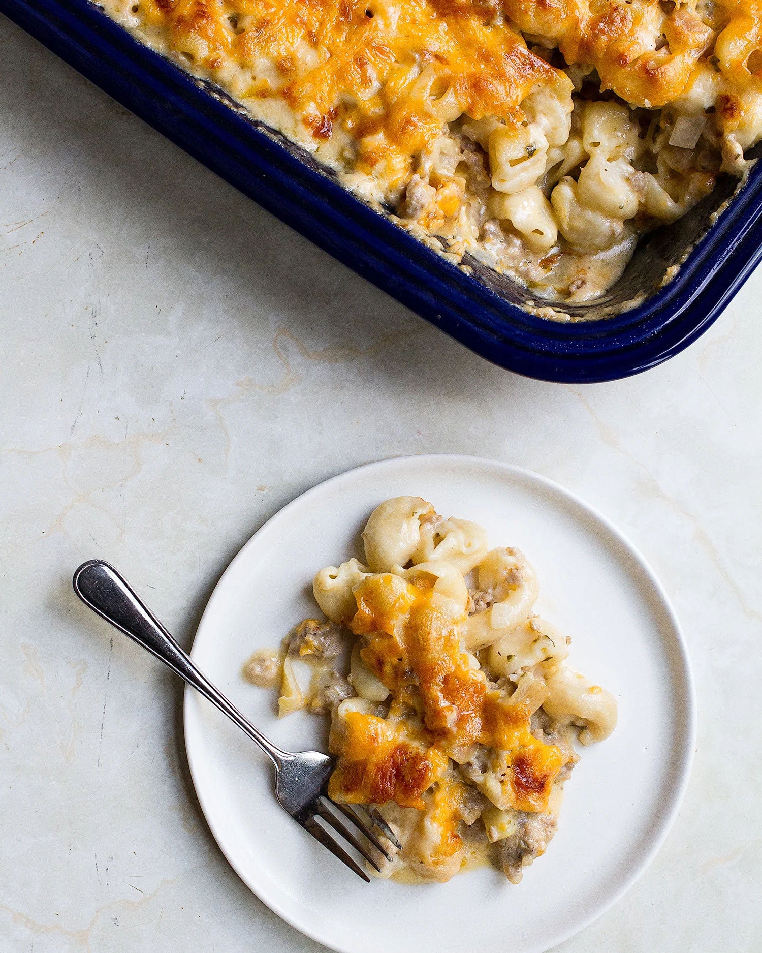 - Тем временем в другой большой кастрюле доведите подсоленную воду до кипения. Добавьте пасту и варите, помешивая, до полуготовности (аль денте на 1/3), около 5 минут. Слейте воду, переложите пасту в кастрюлю с сырным соусом и тщательно перемешайте, чтобы паста покрылась соусом. Переложите массу в форму для запекания 23 × 33 см и посыпьте оставшимся сыром.