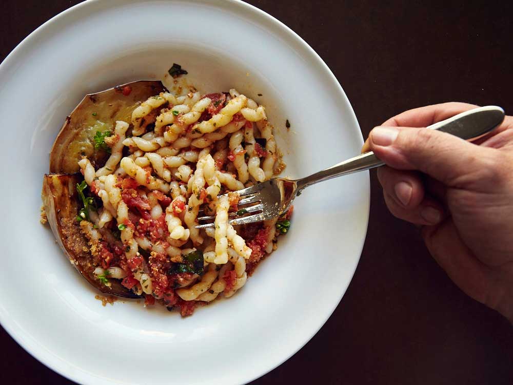 Этот рецепт пасты бузиате с песто по-трапанизски сочетает итальянские и североафриканские традиции, типичные для сицилийской кухни, где влияние арабских поселенцев проявляется в использовании миндаля вместо кедровых орехов в соусе. Блюдо порадует насыщенным вкусом: свежие помидоры, ароматный базилик, хрустящие баклажаны и ореховый оттенок миндаля создают гармоничное сочетание. Подавайте горячим, посыпав поджаренными панировочными сухарями, как основное блюдо на ужин для 4 человек.