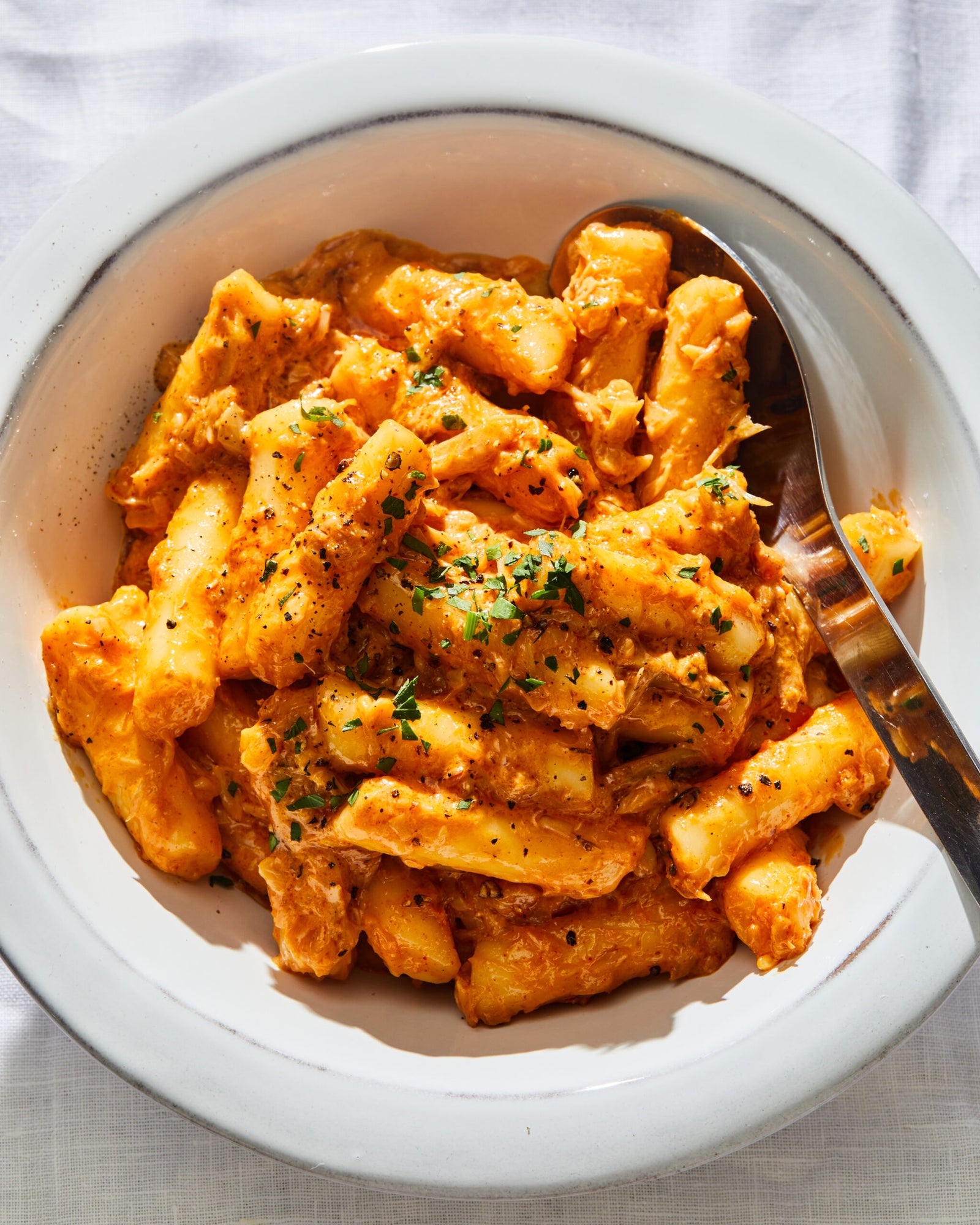 2. Разогрейте оливковое масло в большой сковороде на среднем огне, добавьте нарезанный лук и готовьте, помешивая, до прозрачности, около 5 минут. Добавьте чеснок и жарьте до аромата, около 1 минуты. Введите крем-фраш и гочуджан, тщательно перемешайте. Уменьшите огонь до среднего-низкого, добавьте крабовое мясо и ттэок. Влейте кокосовое молоко и соль, тушите, часто помешивая, до загустения соуса и размягчения ттэок, около 10 минут (если соус подсыхает или ттэок прилипают ко дну, добавьте 1–2 ст. л. воды, по необходимости больше). Приправьте солью и перцем по вкусу, разложите по мискам, украсьте петрушкой и подавайте тёплым.