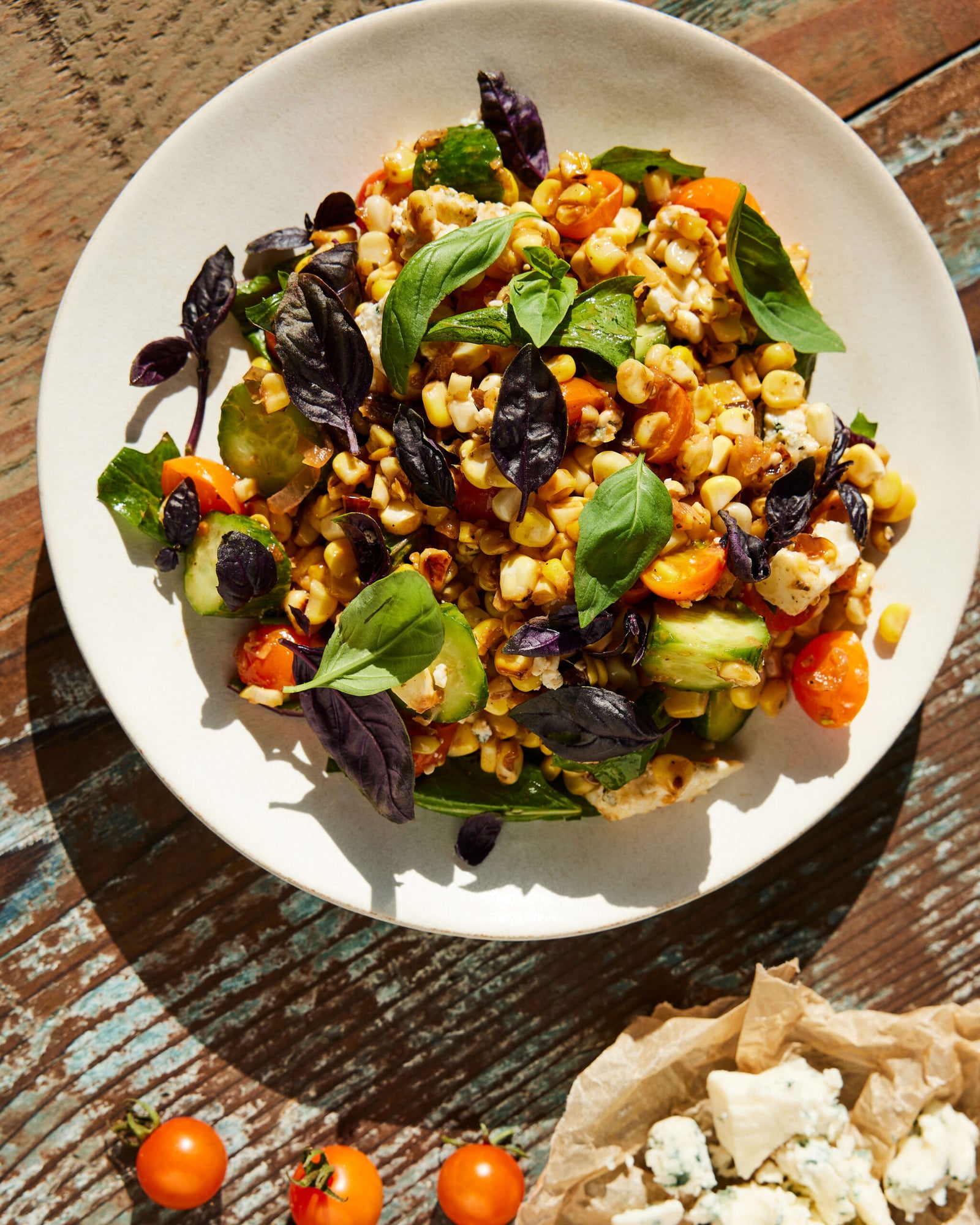 Этот рецепт калифорнийского шеф-повара Скотта Кларка вдохновлён американской кухней и идеально подходит для пикника на побережье. Сладкие зёрна кукурузы, слегка карамелизованные на сковороде, сочетаются с пикантным копчёным голубым сыром, кислыми помидорами и свежей зеленью, создавая освежающий летний салат. Одуванчиковая зелень и базилик добавляют лёгкую горчинку и аромат, балансируя насыщенные вкусы. Подавайте салат комнатной температуры как гарнир или лёгкую закуску.