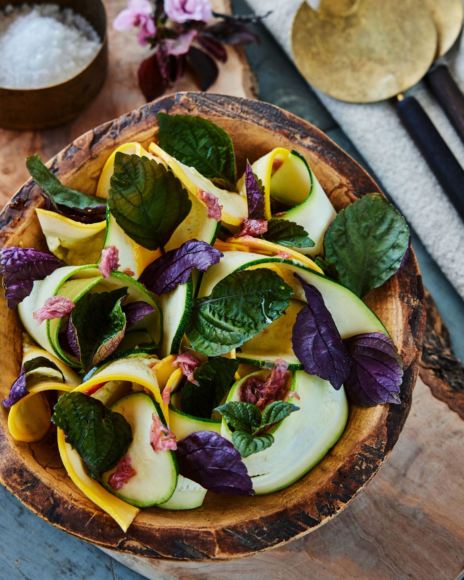 Этот салат с калифорнийскими акцентами создан шеф-поваром Скоттом Кларком из Dad’s Luncheonette, вдохновлённым японской кухней и летними пикниками на побережье. Он сочетает нежные ленточки сырых кабачков и патиссонов с сочными сливами, заправленными пикантным винегретом на основе маринованных слив умэбоши и цветков сакуры, что придаёт блюду цветочные нотки и лёгкую кислинку. Идеален для свежего летнего ужина или пикника, подаётся сразу после приготовления как лёгкий гарнир или основное блюдо.