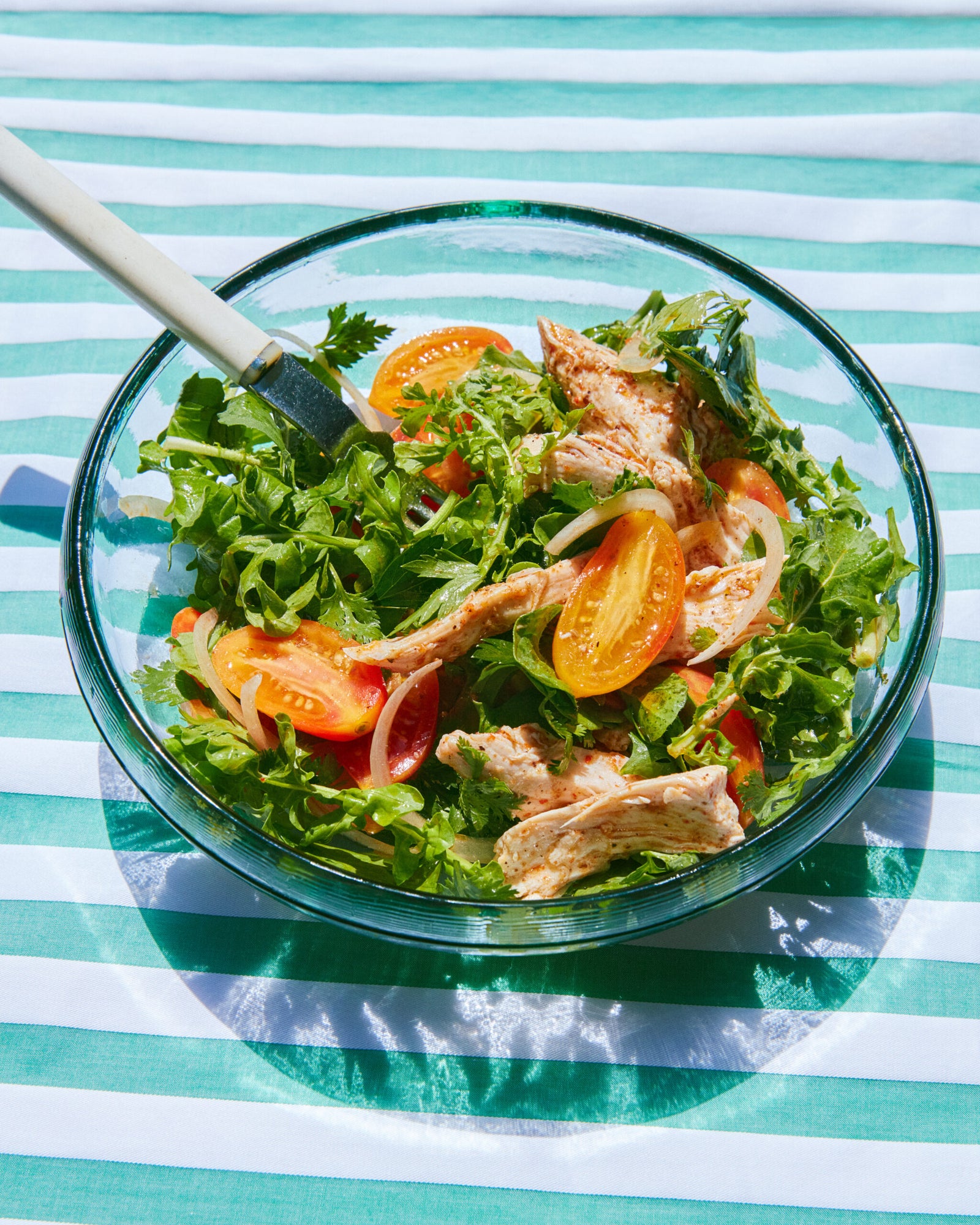Этот рецепт из кулинарной книги «Kismet» американских шефов Сары Крамер и Сары Хаймансон, владельцев ресторана в Лос-Анджелесе, представляет собой лёгкий летний салат для любителей помидоров. Нежно приготовленная на пару курица сочетается с сочными помидорами, свежими травами и ароматной винегретной заправкой с нотками специй, такими как алейпо и сумах, что придаёт блюду яркий, пряный вкус с лёгкой кислинкой. Идеально для тёплой погоды — подаётся сразу после сборки как основное блюдо на ужин или лёгкий обед.