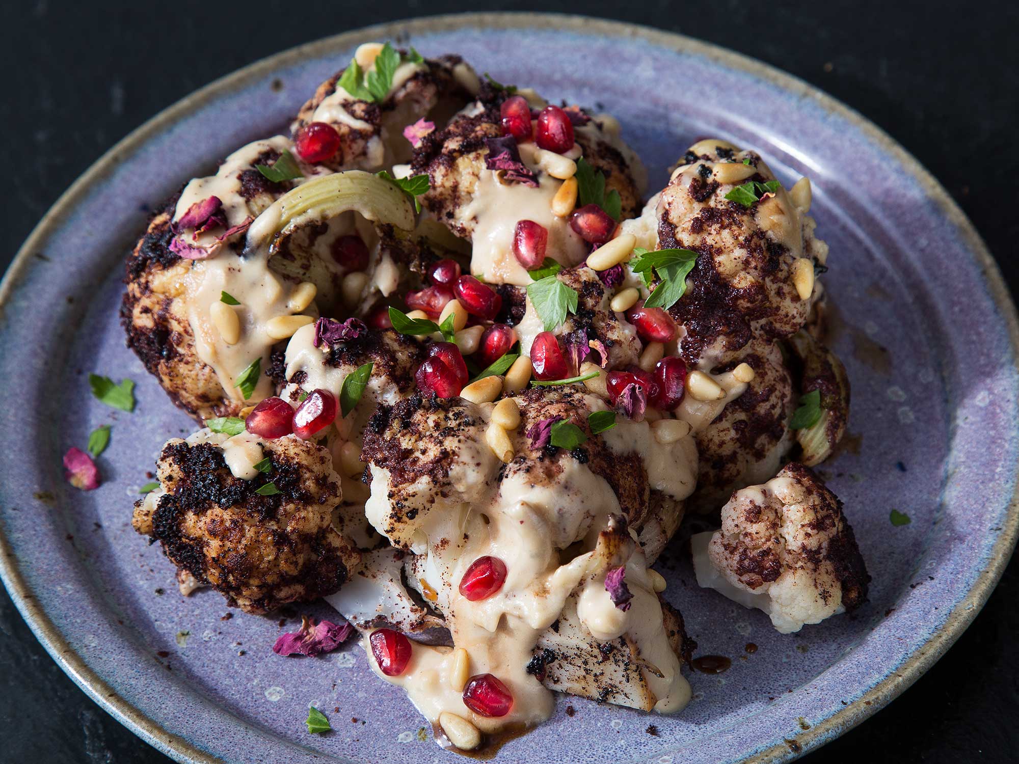 Шаурма из цветной капусты с гранатом, тахини и сосновыми орехами