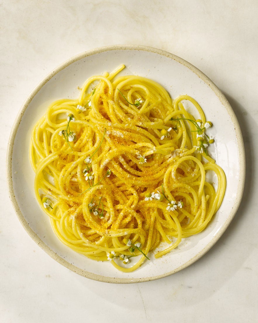 Этот изысканный рецепт спагеттони с жасмином, шафраном и ромашкой создан шеф-поваром Антонией Клюгманн из итальянского ресторана L’Argine a Vencò. Блюдо сочетает нежные цветочные ароматы с кремовой текстурой сливочного масла и шафрановым оттенком, создавая утончённый вкус, напоминающий о средиземноморской кухне. Подавайте сразу после приготовления как основное блюдо, украсив свежими цветками ромашки для эстетического эффекта.