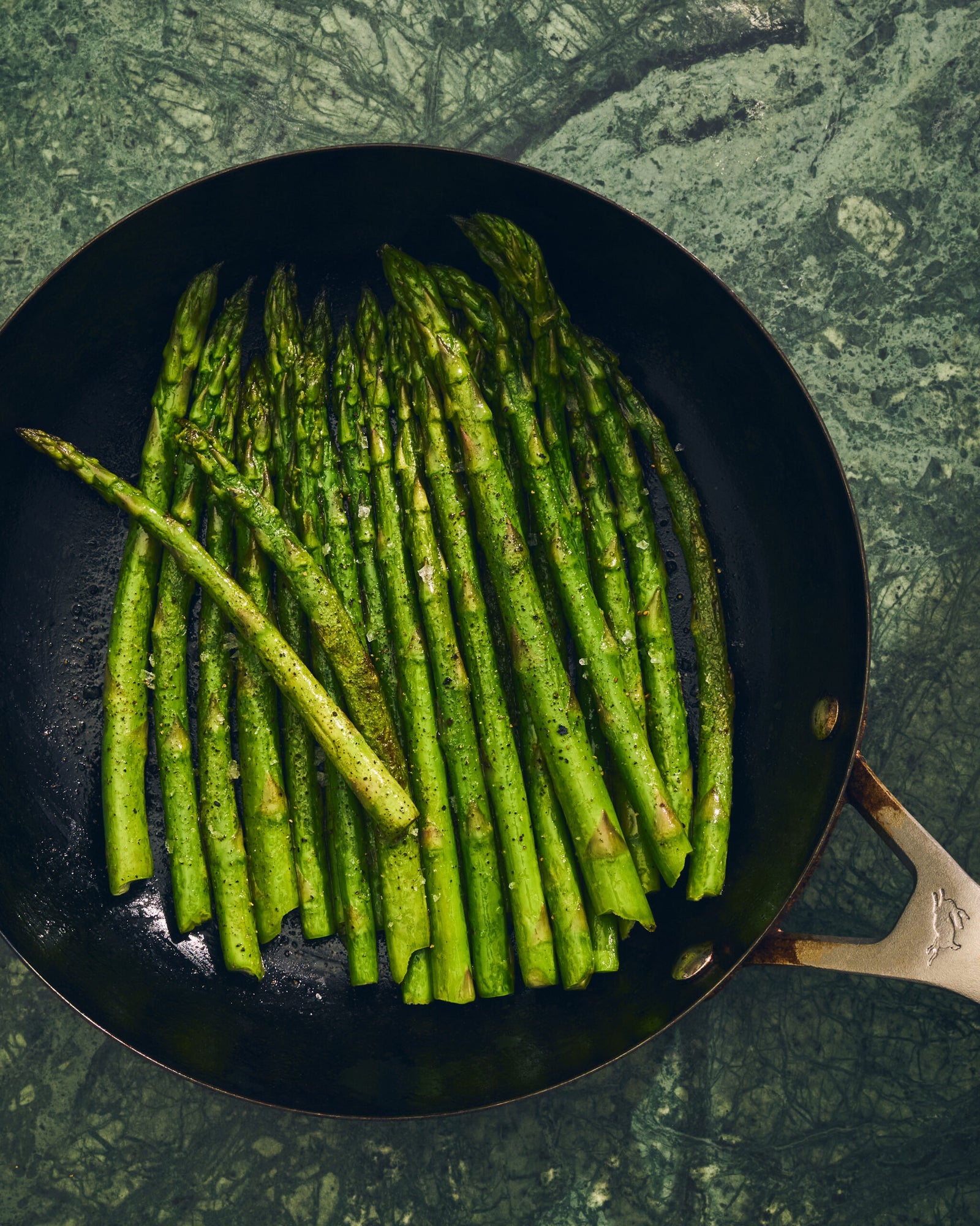 1. Разогрейте большую сковороду на среднем огне, добавьте сливочное масло. Когда пена осядет, выложите спаржу и встряхните сковороду, чтобы стебли покрылись маслом. Накройте крышкой и готовьте, периодически встряхивая, 3 минуты, пока спаржа не приобретёт ярко-зелёный цвет и не останется хрустящей.