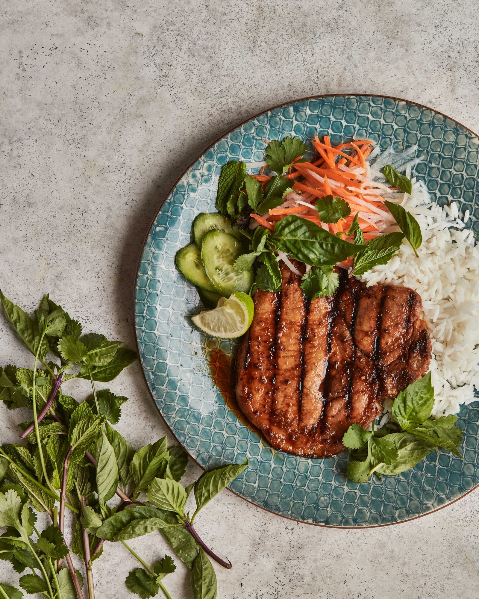 Разогрейте большую гриль-пан на сильном огне. Когда поверхность начнёт дымить, выложите отбивные в один слой, не перегружая сковороду. Жарьте по 2 минуты с каждой стороны до появления поджаристых пятен и полной прожарки (внутренняя температура около 63 °C). Переложите на тарелку, накройте фольгой и дайте отдохнуть. Повторите с оставшимися отбивными. Подавайте сразу с горячим белым рисом и соусом нюок чам.
