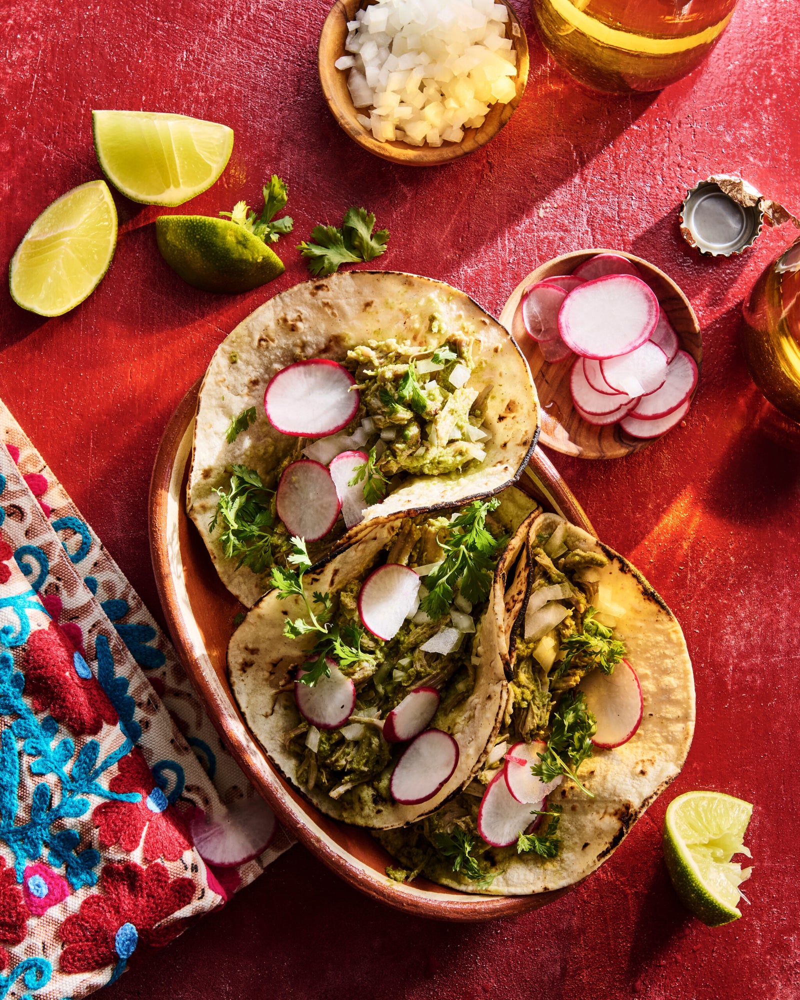 - Подавайте горячим с теплыми кукурузными лепешками (тортильями). При желании украсьте тонко нарезанным редисом, кинзой и мелко нарезанным луком.