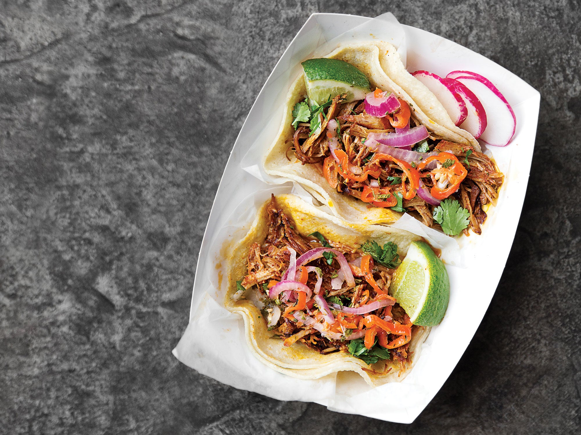 Кочинита пибил — традиционное блюдо юкатанских майя, приготовленное в подземной печи (пиб), где мясо заворачивают в банановые листья и запекают на горячих камнях. Этот рецепт, вдохновлённый техникой ресторана Chando’s в Калифорнии, адаптирован для современной кухни с использованием чугунной кастрюли. Свинина пропитывается земляным ароматом пасты ачиоте и цитрусовыми соками, становясь нежной и остро-пряной. Тако подаются в тёплых кукурузных лепёшках с маринованным луком, кинзой, редиской и лаймом.