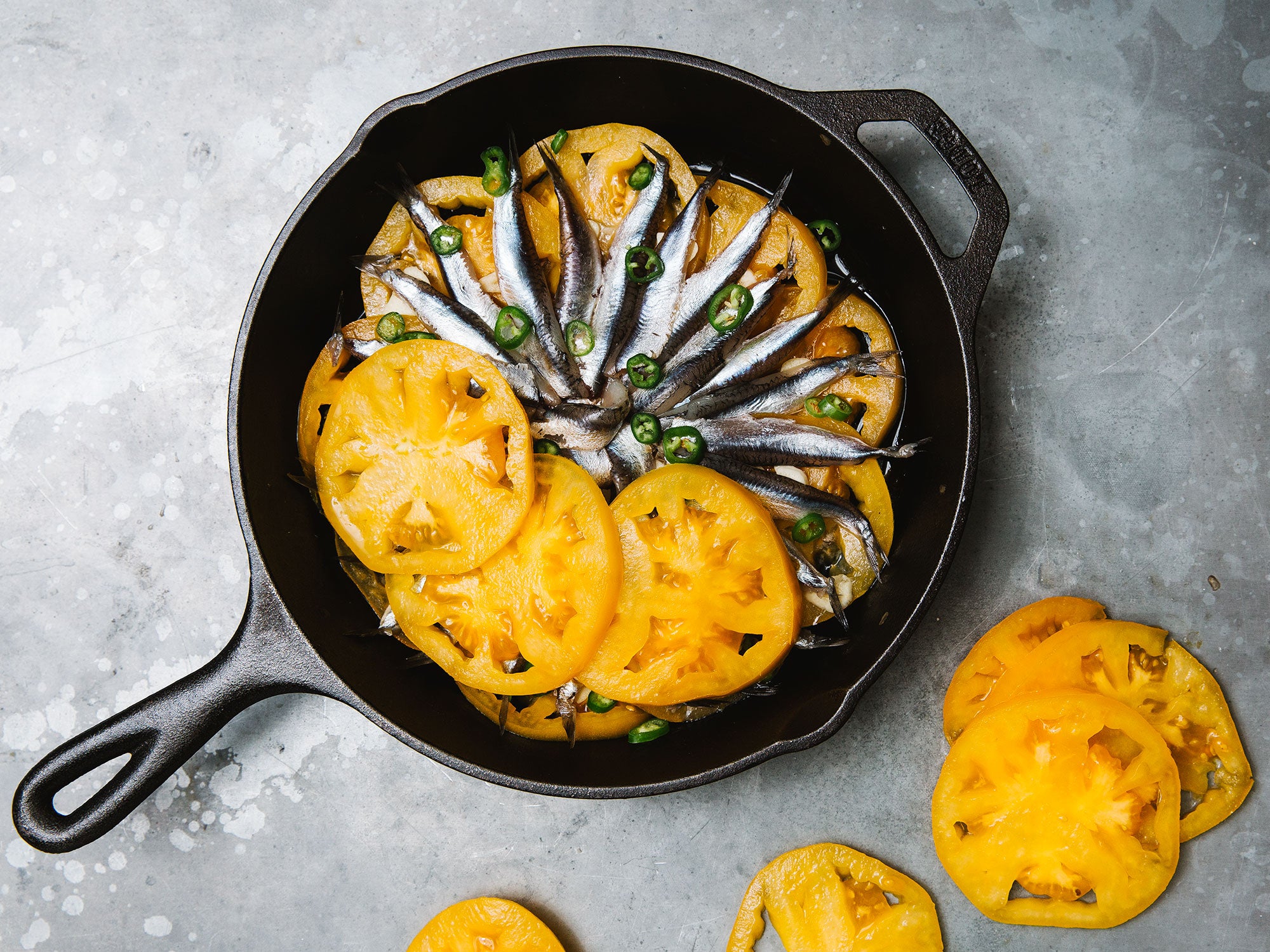 - Подготовьте сковороду и первый слой. Возьмите чугунную или другую сковороду с толстым дном диаметром 30 см. Влейте оливковое масло и наклоните сковороду, чтобы полностью покрыть дно. Разложите кружки помидоров в один слой так, чтобы они немного перекрывали друг друга и покрыли дно сковороды. Сверху равномерно распределите нарезанный чеснок.