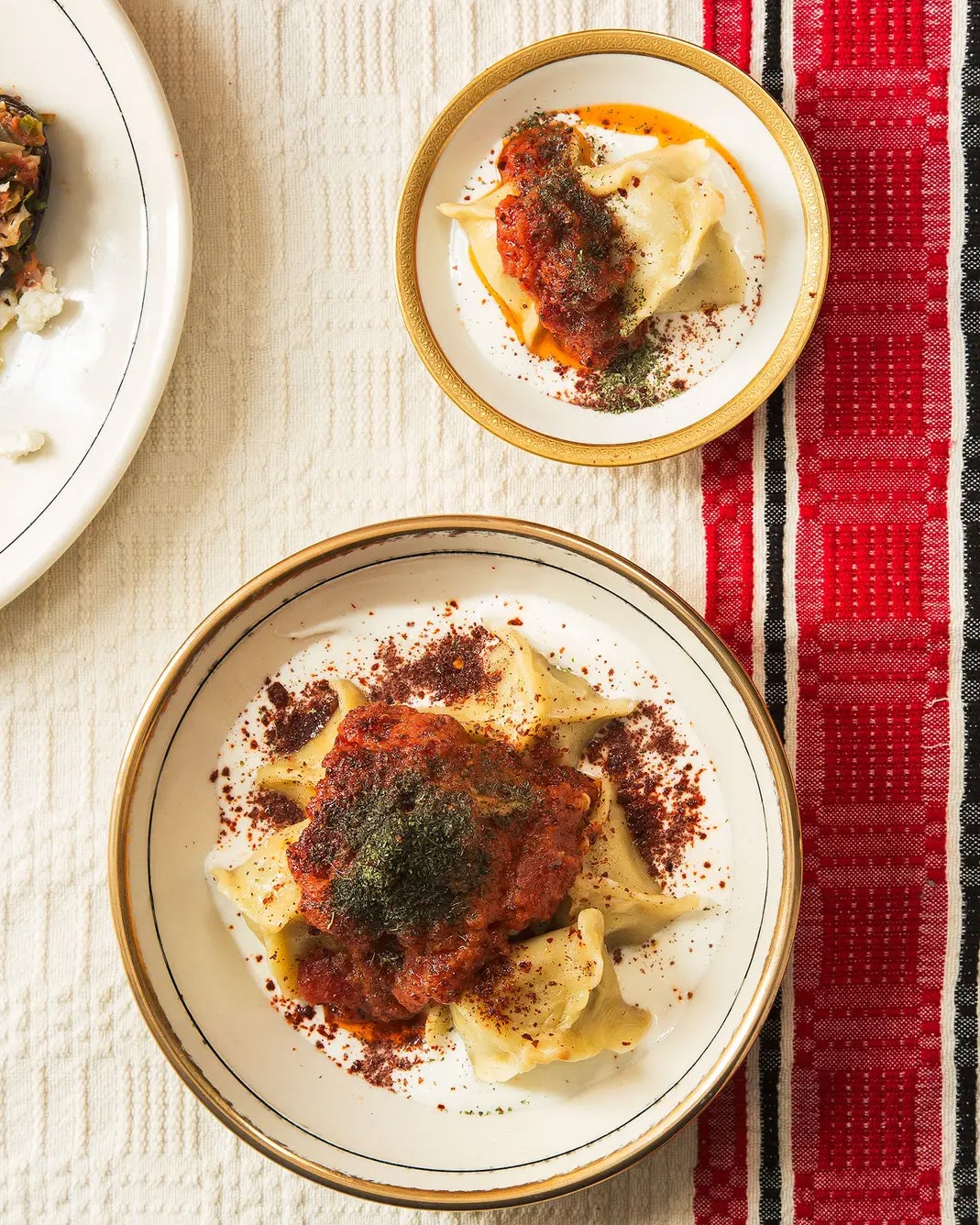 Считается, что эти традиционные мясные вареники были принесены в Анатолию по Шелковому пути из Центральной Азии. Несмотря на древнее происхождение, манты занимают важное место на турецком столе как сытное блюдо с ярким ароматом специй. В этой версии, вдохновленной армянскими традициями, вареники сначала запекают в духовке, чтобы мясо пропитало тесто тостовыми нотками, а затем варят. Подают их горячими с йогуртовым соусом, томатным соусом на буром масле и посыпкой из специй для свежести и кислинки.