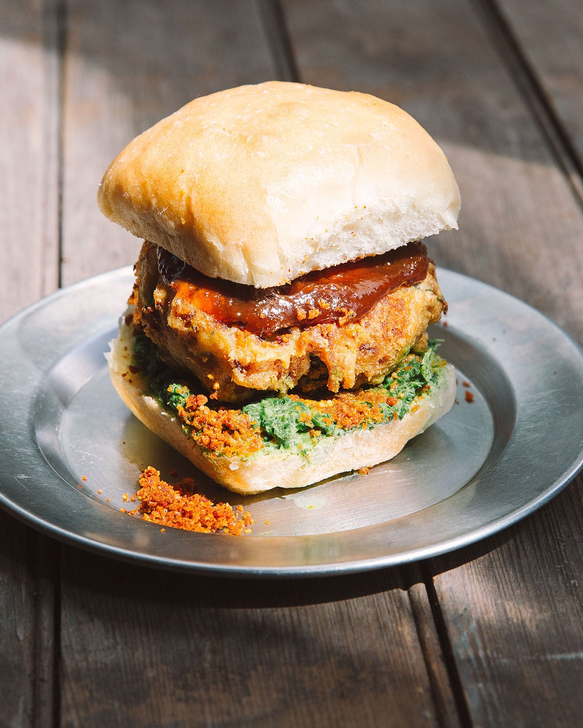 - Разрежьте булочки пополам, слегка подогрейте в духовке при 150 °C 2 минуты или на сковороде; смажьте чатни, положите фриттер и подавайте горячим, optionally обмакнув в чатни.