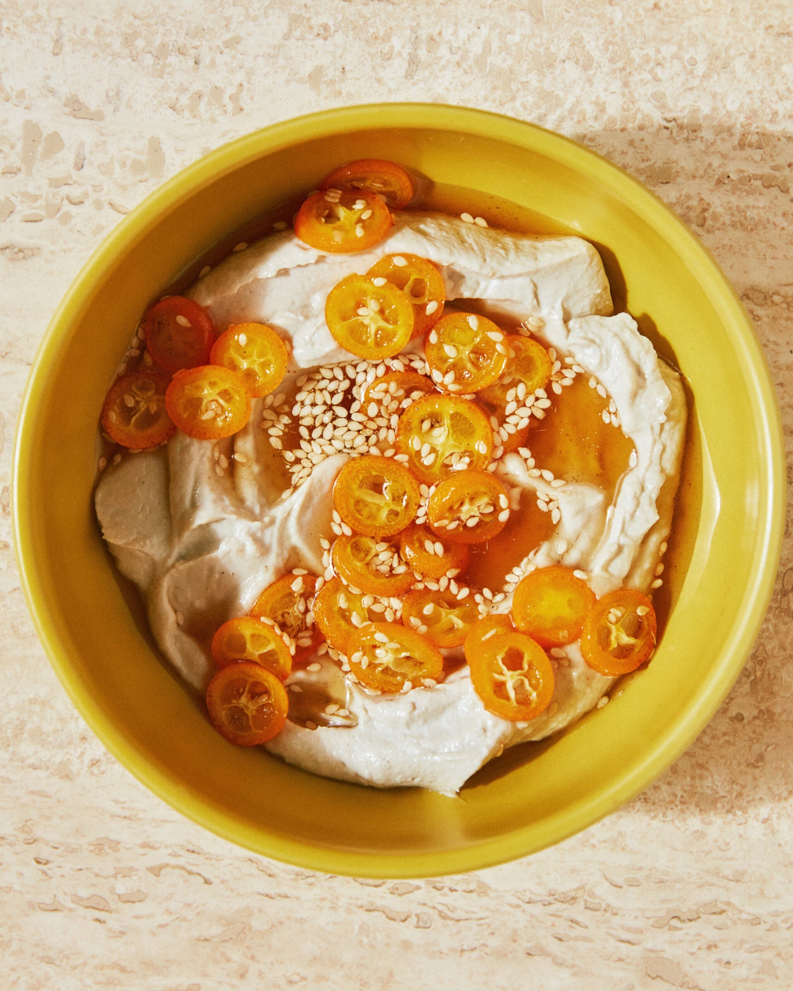 - Переложите тахиновый дип в миску для подачи, выложите сверху медовые кумкваты и подавайте.
