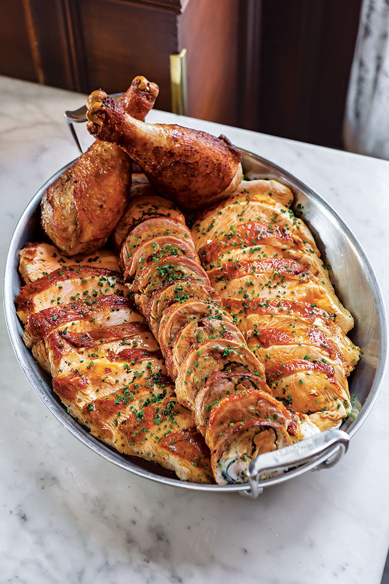 Рецепт запеченной индейки из ресторана Bouchon Bistro в Калифорнии, где птицу разделяют на части для оптимальной прожарки и насыщенного вкуса. Грудку и голени маринуют в брине с медом, лимоном, травами и чесноком, а бедра фаршируют нежным муссом из индейки с розмарином и тимьяном, формируя роллы. Блюдо сочетает сочное мясо с ароматным соусом на основе бульона и колбаски, идеально для праздничного ужина вроде Дня благодарения. Подавайте с нарезанной грудкой, роллами и голенями, полив соусом и посыпав зеленью.