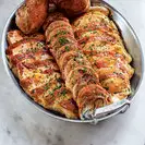 Рецепт запеченной индейки из ресторана Bouchon Bistro в Калифорнии, где птицу разделяют на части для оптимальной прожарки и насыщенного вкуса. Грудку и голени маринуют в брине с медом, лимоном, травами и чесноком, а бедра фаршируют нежным муссом из индейки с розмарином и тимьяном, формируя роллы. Блюдо сочетает сочное мясо с ароматным соусом на основе бульона и колбаски, идеально для праздничного ужина вроде Дня благодарения. Подавайте с нарезанной грудкой, роллами и голенями, полив соусом и посыпав зеленью.