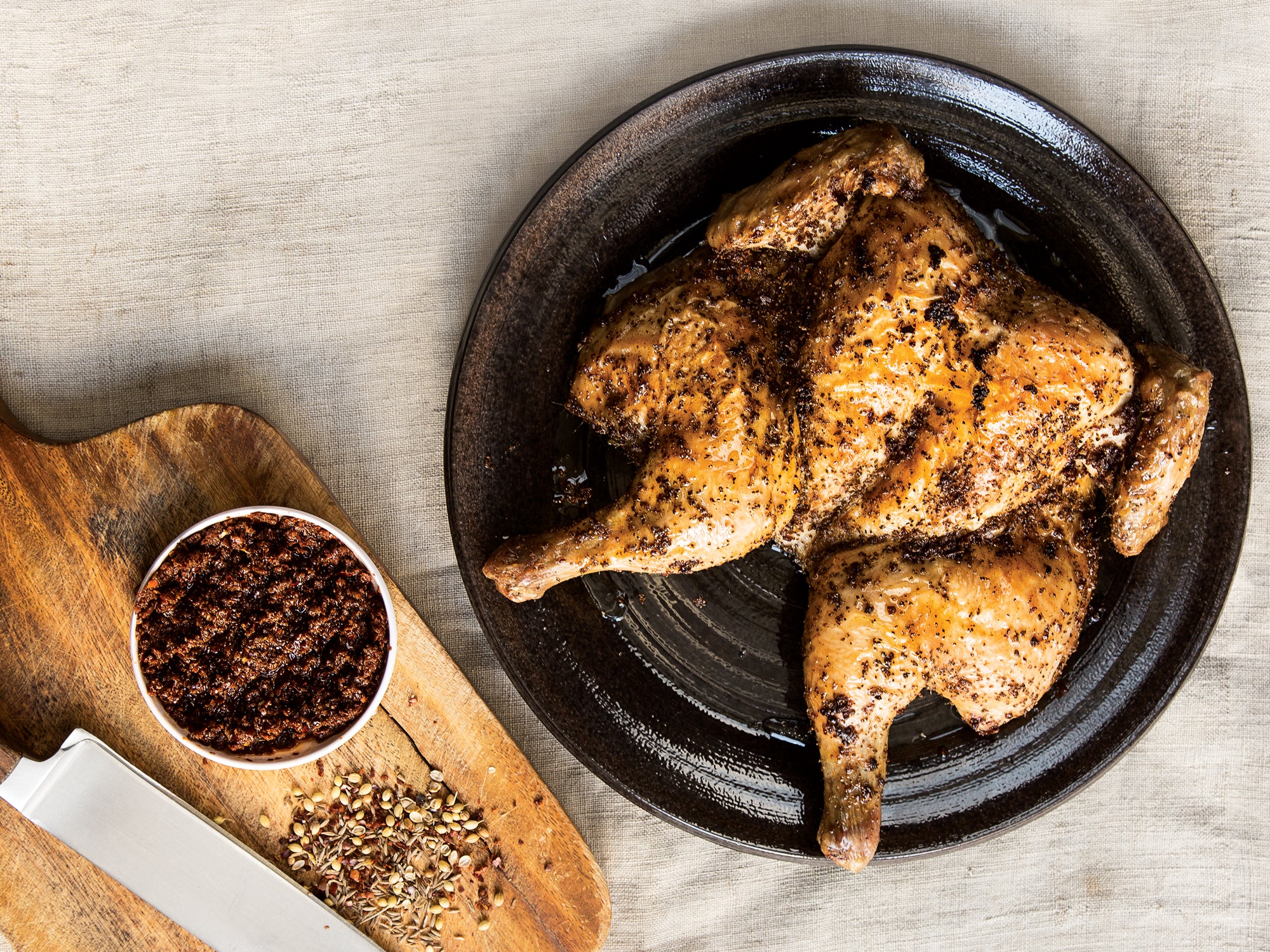 Харриса — это универсальная североафриканская паста из перца, которая придаёт сочности этому запечённому цыпленку. Рецепт разработан шеф-поваром Майклом Соломоновым из ресторана Zahav в Израиле, где вместо свежих или сушёных чили используется молотый перец алеппо для уникального земляного вкуса с нотками кумина, тмина и кориандра. Блюдо сочетает традиции ближневосточной кухни, идеально подаётся с израильским салатом из огурцов для свежести.