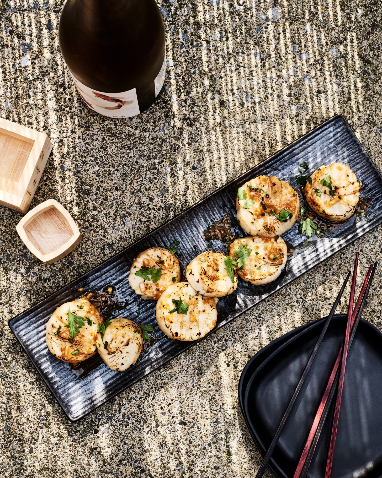Этот рецепт происходит из японской кухни и вдохновлён традиционной приправой юзу кошо, которую шеф Тадаши Оно открыл на острове Кюсю. Блюдо сочетает нежные морские гребешки с остро-кислым винегретом на основе красного юзу кошо, который добавляет аромат цитруса, специй и лёгкой жгучести. Готовые гребешки подаются горячими, сбрызнутыми соусом и посыпанные петрушкой, идеально как закуска или основное блюдо на гриле для пикника.