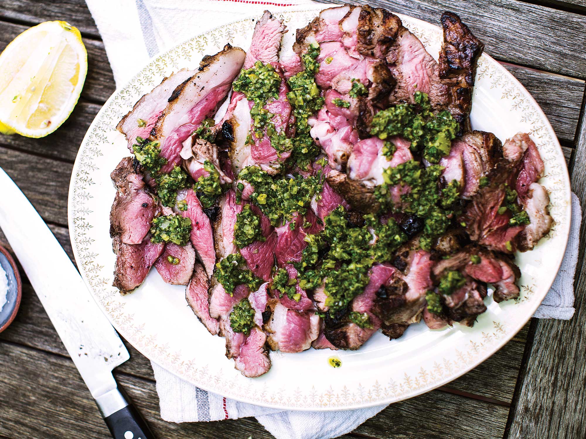 Этот рецепт происходит из Южной Африки, где бараний румп (часть вырезки, соединяющая ногу и поясницу) традиционно готовят на браай — национальном барбекю у огня. Мясо получается нежным и сочным благодаря слою жира, который подрумянивается на гриле, а кислая свежесть сальсы верде на основе петрушки и мяты идеально дополняет насыщенный вкус баранины. Подавайте тонко нарезанным с соусом для ужина на 6 человек, как основное блюдо с гарниром из овощей или салата.